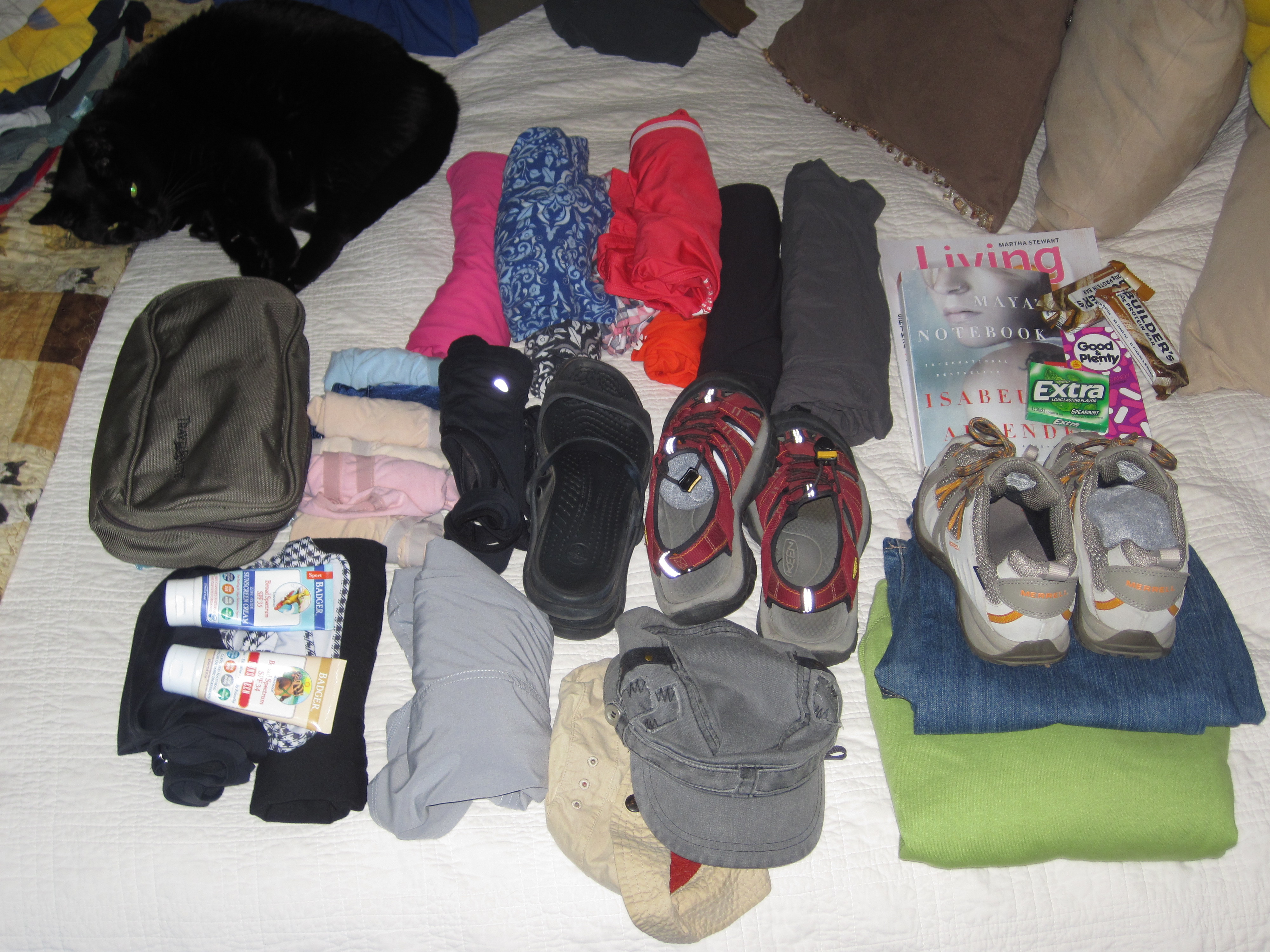 Below you can see what’s going in my (Erin’s) suitcase. Clothes; swimsuit; hats; toiletries; my new Martha Stewart Living magazine (ooh, since I first wrote this, my Oprah mag and Real Simple also arrived. Don’t tell Jeff I snuck those in, too), a new book and snacks for the plane; and shoes. Three pairs of shoes seems a little excessive, and it is, but I’m not confident enough in myself to hike the Virgin River in just Keens; I want a little more support, so I’m taking a more sturdy pair of shoes for that. The Tevas are for general hiking around, and I just love my Croc slip ons for summer, so I’m taking those as well. I have one skirt I’m packing in case we want to look a little nicer to go out to dinner or whatever. It’s actually a skort from Athleta, so I will look good hiking, too. The jeans and sweatshirt are for the plane (it’s always freezing on airplanes) and for when we go out stargazing at night. Of course all my clothes are rolled to save space. (As an aside, I actually read a blog post this week where someone tested this rolling theory. Read about their results. It really works!)