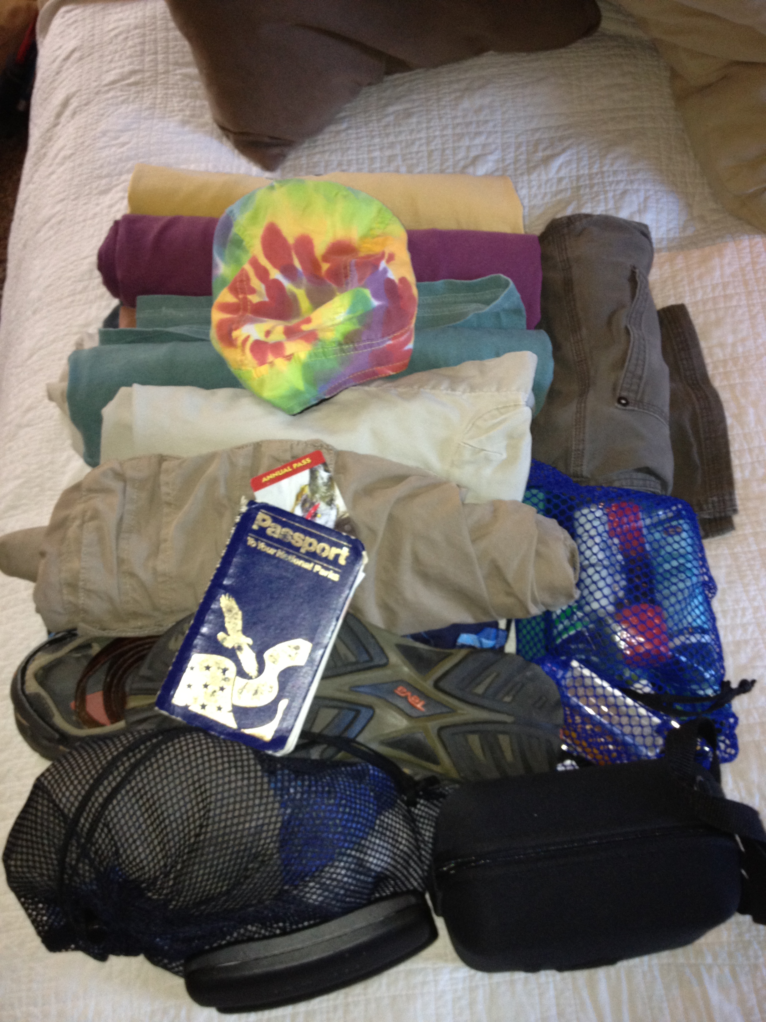 Jeff’s clothes, etc. for Zion. Note the very important National Parks Passport. Cool kids carry these.