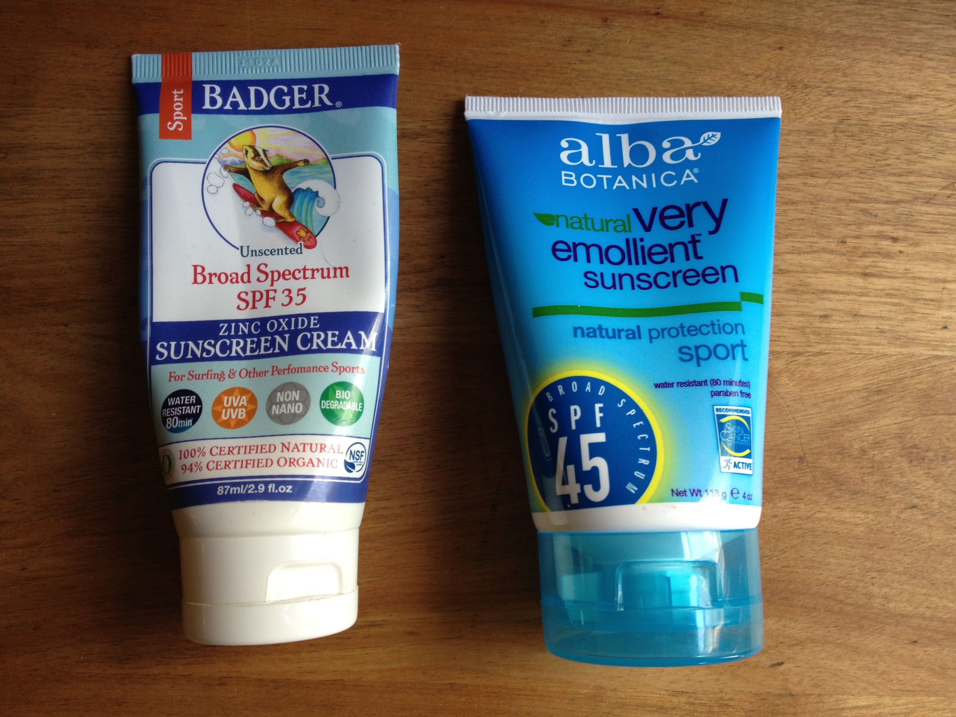 Luckily, this trip we are packing for a trip with only one climate – HOT. Erin’s biggest question was whether to bring any t-shirts at all or just tank tops. She opted in favor of two t-shirts just in case a sunburn ensues, but she’s also armed with Badger zinc oxide based sunscreen, so hopefully it won’t be a problem. We’ve been reading a lot about sunscreens lately on the Environmental Working Group’s website and how some of the chemicals they use in most sunscreens are not ideal for putting into your body. Of course we think any sunscreen is better than no sunscreen, but we’re trying out some new brands this year that are hopefully a little better for us. So far Erin likes the Badger brand but Jeff likes the Alba Botanicals better because it goes on more easily.