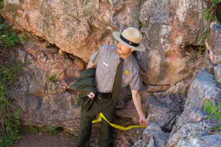 Wind Cave National Park was our first stop. Wind Cave is not the longest cave in the US, that spot’s taken by Mammoth Cave in Kentucky, but it’s still the 6th largest cave in the world and it’s quite impressive. Wind Cave gets its name because it’s actually windy. The pressure inside the cave, which can change from day to day, either creates a wind or a vacuum, and if you stand outside the cave and put your hand in front of the (very small) original opening to the cave, you can feel it. Actually, only rangers are allowed to go to the original opening now, so they put a ribbon in front of the opening to show visitors what its doing on a particular day. For us, it was blowing, as you can see below.