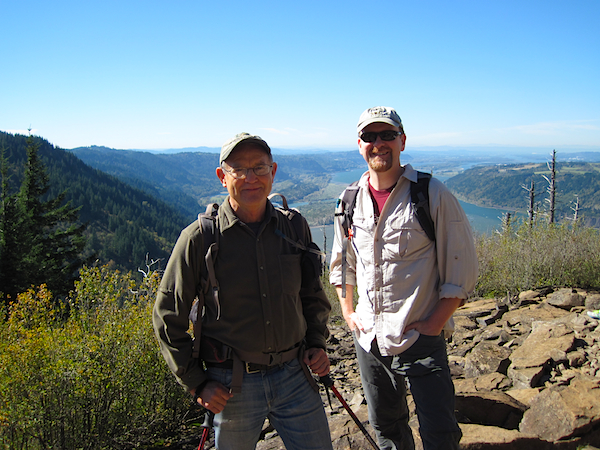 Getting to the top of Angel’s Rest requires a bit of a scramble between some big boulders, but the extra climb — on a short spur trail off of the trail that continues eastward — is the coup de grace of the hike.  Don’t miss it.  What starts out as a narrow spit of land with a dizzying dropoff (use caution — over the years, a few hikers have fallen to their deaths here) and, at least on the fall day we visited, a staggeringly strong east wind, widens out to a vegetated plateau with a stunning view of the Gorge, the Columbia River, the forest below, and a glimpse of Washington’s Mt. Adams.  Awesome!