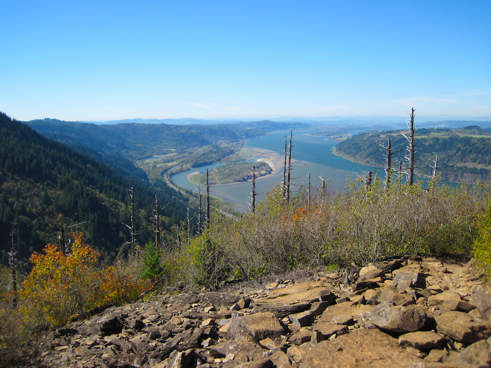 As the trail nears the top, a few areas of boulders and broken rocks face west, providing nice windbreaks from the prevailing east wind, great picnic spots, and amazing views of the Columbia River and Portland in the distance.  On a sunny weekend, you’ll share the view with other hikers, but sacrificing solitude for scenery seems well worth it.