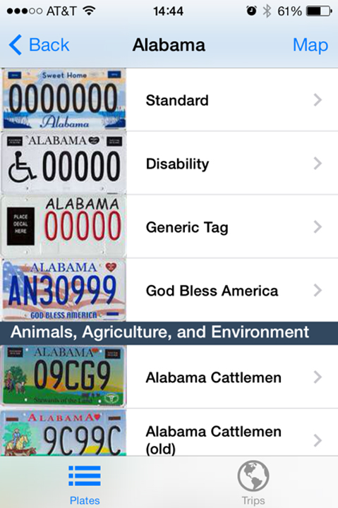 • App lists number of states seen, and different colors on main list differentiates between plates found or not found.