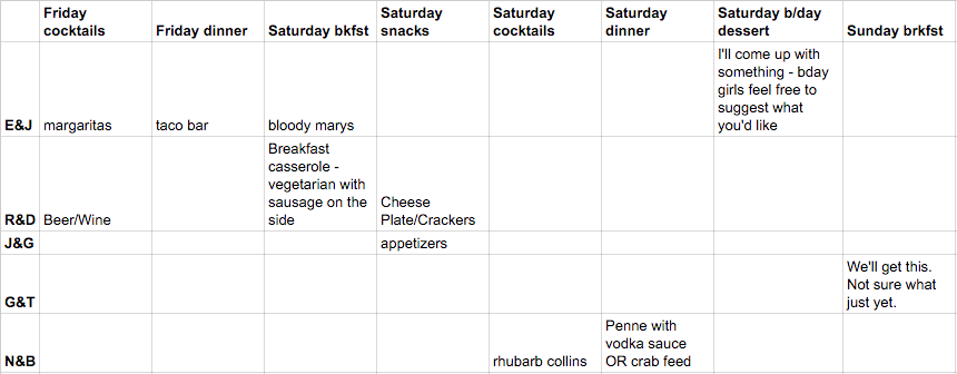 Finally, we used a shared Google Sheet to plan who was bringing which meals — and, more importantly, which cocktails.