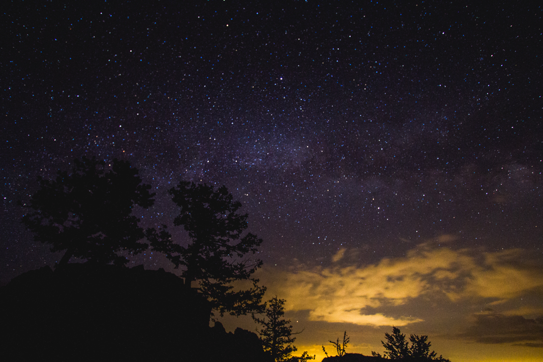 My first attempt was at Rocky Mountain National Park. Although the location I chose for my shoot seemed really remote and dark, there was actually a surprising amount of light coming from the valley below. But it was still exciting to try making photos! And the light made for some really interesting compositions. Unfortunately, the clouds came in and covered most of the stars right around the time the Milky Way was finally visible.