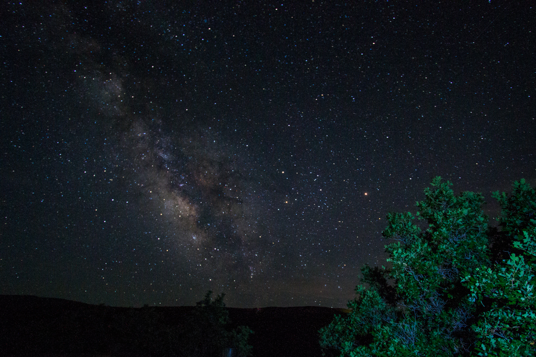Night sky photography requires a few specific tools. It has to be done with a camera that can maintain an open shutter for a long period of time. In order to keep the camera from jiggling during the long open shutter, a tripod is needed. I used a shutter release cable and mirror lock-up to try and cut back on any camera shake as well. A fast, wide-angle lens is recommended. I have a really good wide angle lens, but it’s not necessarily fast (3.5 instead of 2.8 or 1.4). However, I wasn’t willing to spend the money to get a better lens just to do an experiment, so armed with the tools I had, my awesome sherpa/cheerleader husband and I went out to try and make some photos.