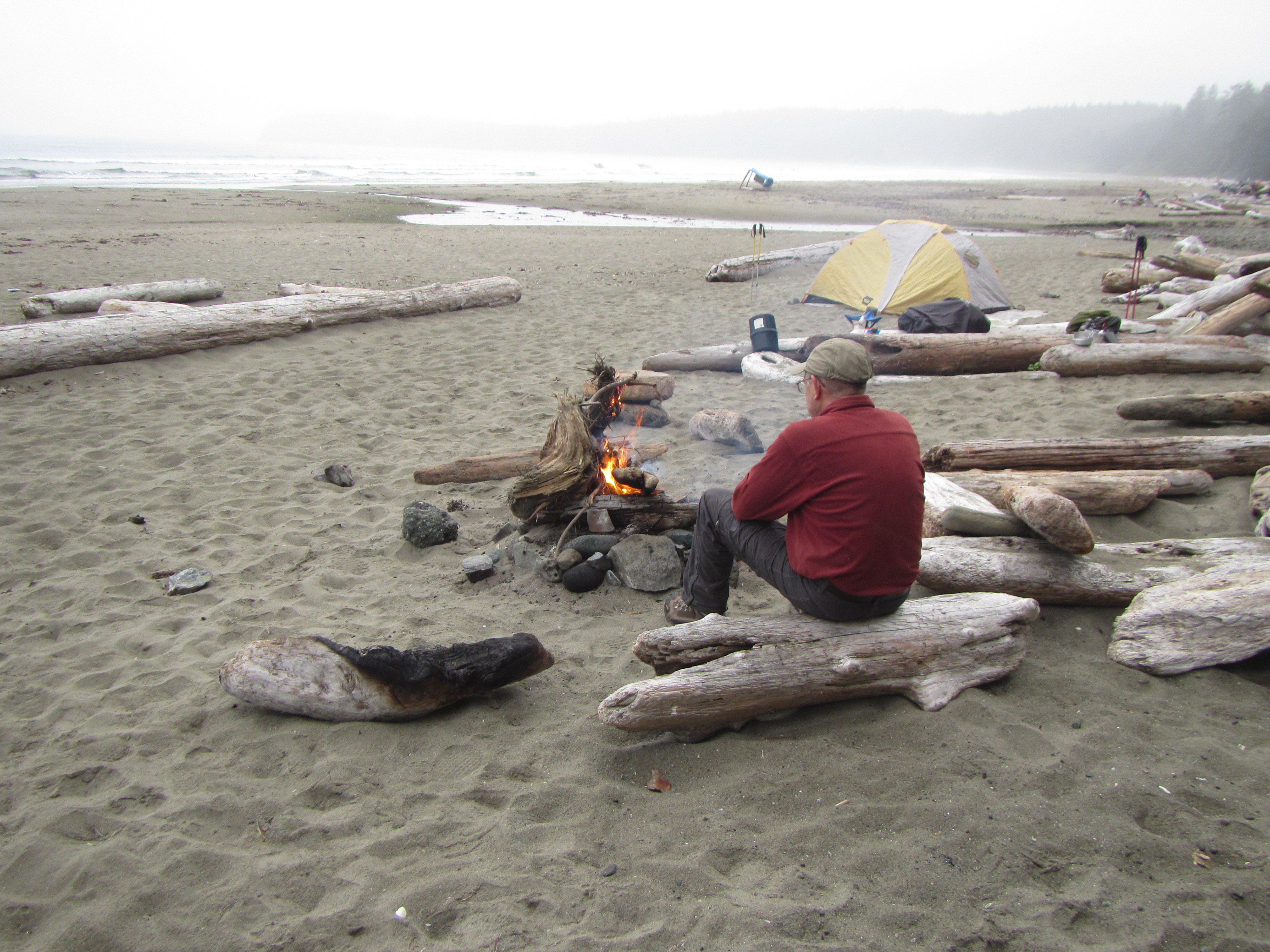 For our “campsite,” we chose a spot on the sand well away from the surf, near the trees and a trickle of a creek just north of the Point of the Arches. A few pit toilets are hidden in the forest just above the beach; look for markers or ask neighboring campers for directions. Driftwood campfires are permitted, so we found an established fire ring and warmed up near the fire before calling it a night — a heavy mist was falling.