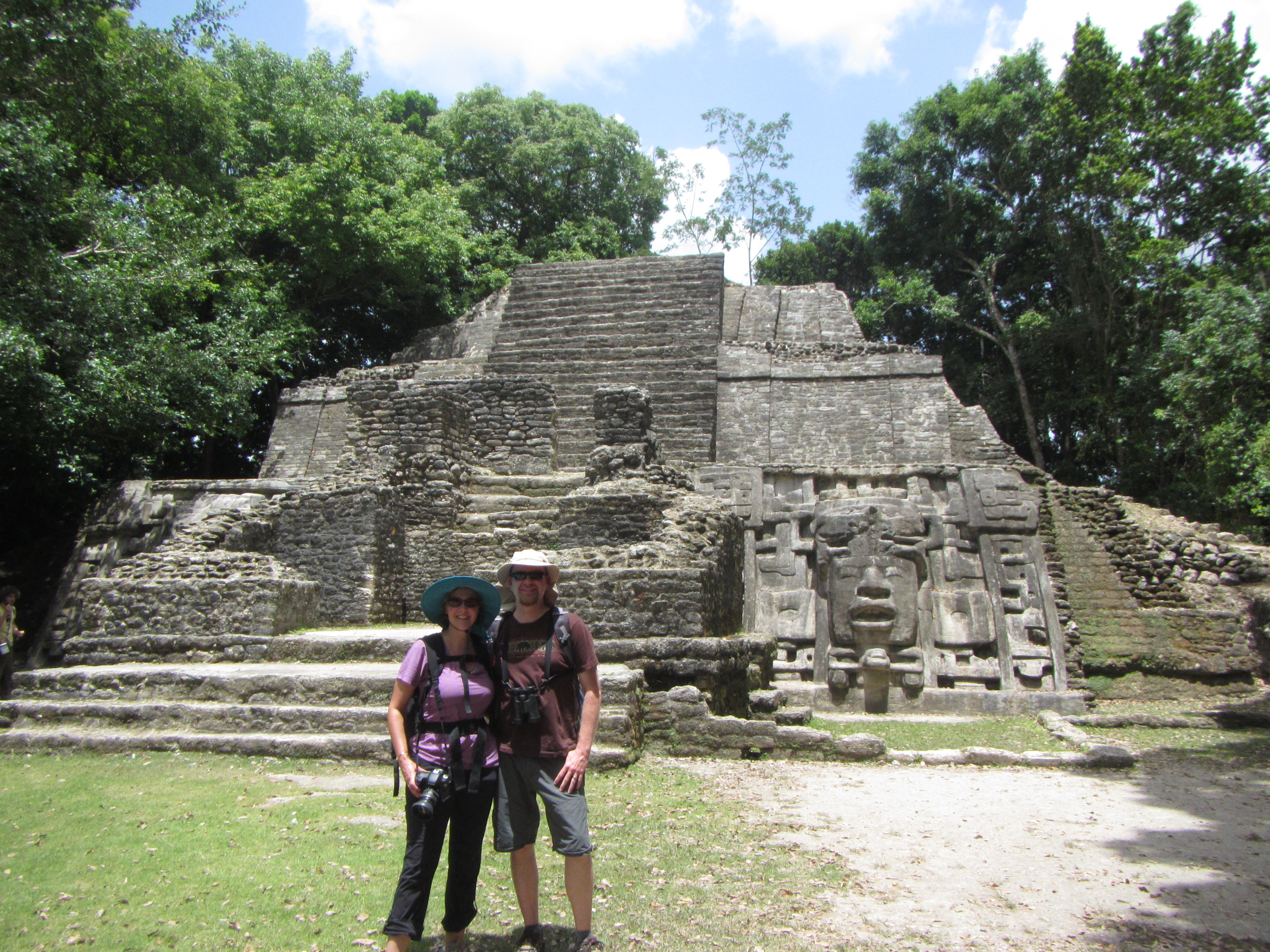 Lamanai features a small museum near the ruins with exhibits of recovered items, some of the larger stones, and many informational placards. After spending a little time at the museum, our guide, Colin, led us around the ruins and told us about the trees and plants in addition to the history. The ruins are known for their long-lasting architecture and beautiful jungle setting on the New River. We were able to walk around the grounds and look at several structures and we even got to climb the High Temple. It was a steep set of stairs (Jeff is not a fan of heights and was nervous but he did great), but the view from the top was fabulous! The Mayans were pretty amazing with their construction projects, that’s for sure! Not many condos being built today that will be standing in 2000 years.