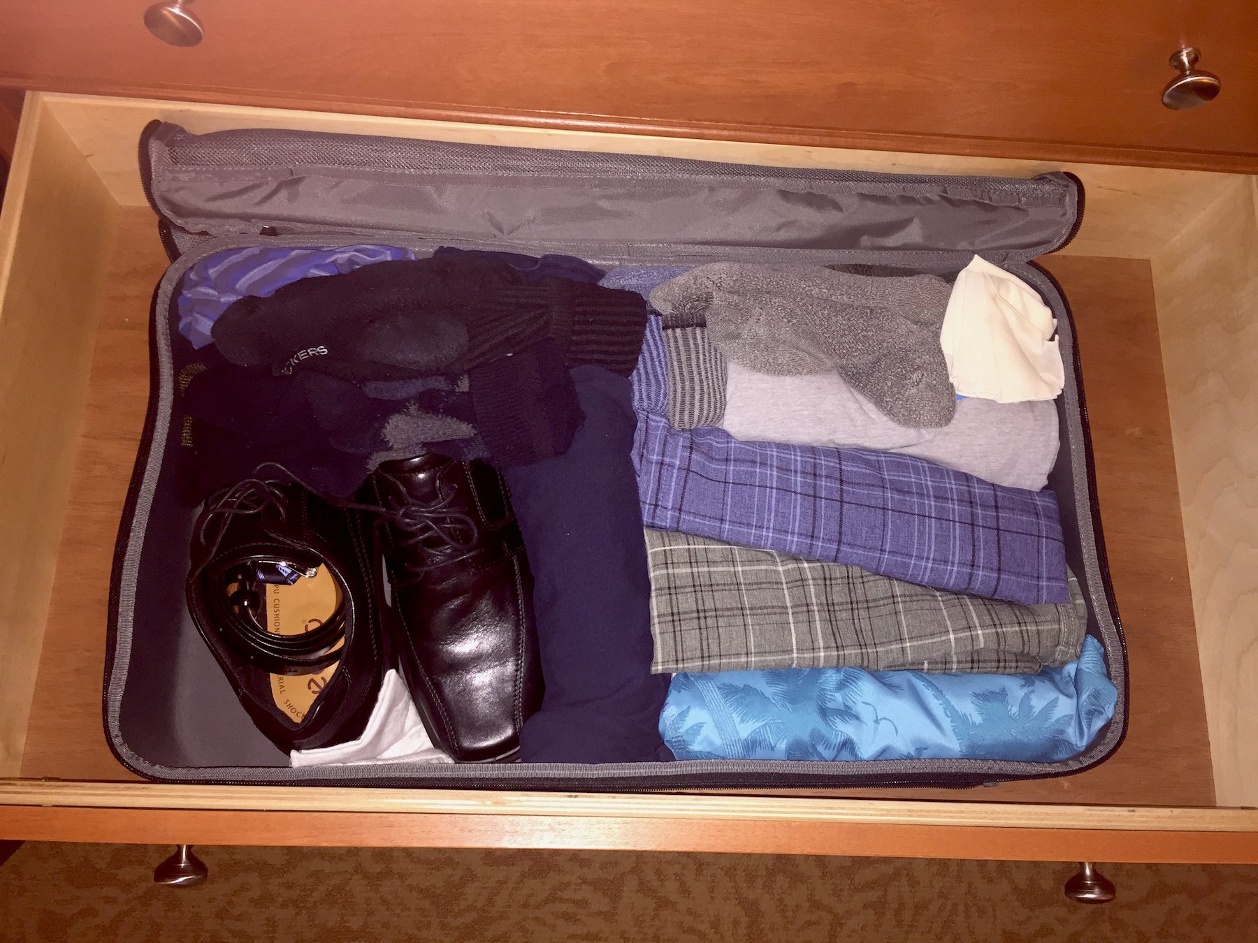 I loved the organizational aspect of the bag. The removable trays can easily be placed in dresser drawers or on a shelf while traveling. They don’t take up a significant amount of the space inside the bag, a concern someone mentioned when we were describing the bag to them, and the organizational benefits far outweigh the negligible loss of space. We were easily able to pack — with room to spare — everything that both of us would need for a long weekend trip in one Oregami bag, including casual wear, clothes and shoes for two formal events, and all of our toiletries. We were pleasantly surprised that our dress shoes easily fit in the trays. Dividing our things up among the three separate compartments, being able to secure them with the zippers, and the see-through mesh helped us keep our clothing easy to find, organized, and fairly wrinkle-free.