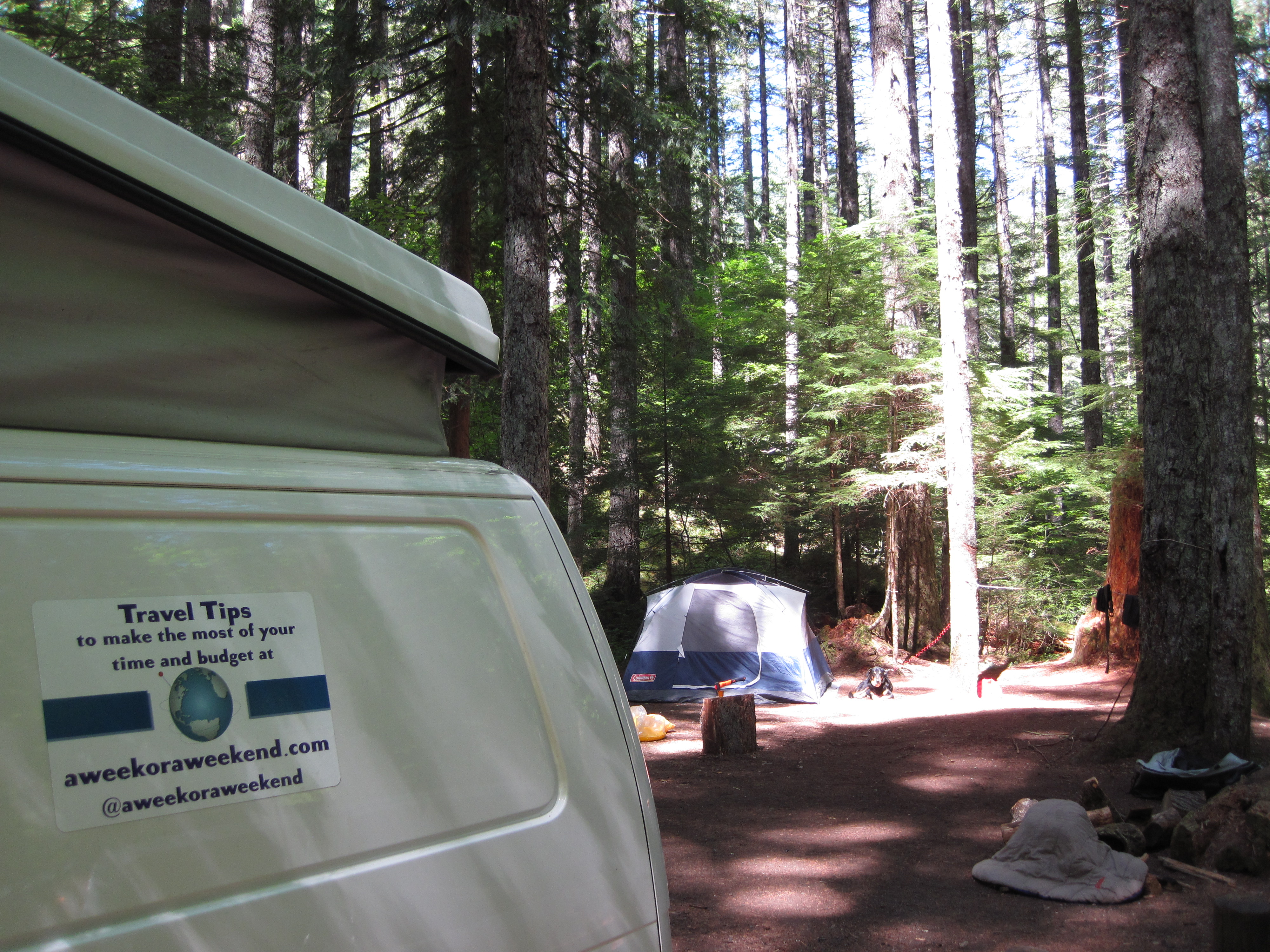 We’ve always had luck getting a site without a reservation by just showing up at a national park campground early in the day; I’m not sure I’d recommend that at a state park, at least in Oregon, where state park campgrounds are often booked full months in advance. Most national park campgrounds are still pretty inexpensive. State campgrounds vary but are still pretty inexpensive compared to a hotel, especially for a family.