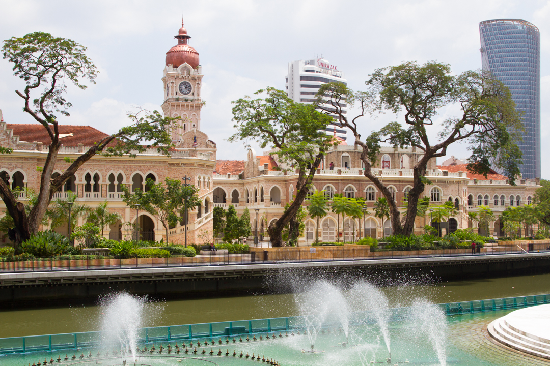 The Sultan Abdul Samad Building, also on the edge of the square and one of the oldest Moorish style buildings in KL, is gorgeous, with fantastic copper domes, spiral staircases, and a clock tower. It was Erin’s favorite building in KL. It was fascinating to see that building juxtaposed with nearby modern skyscrapers.